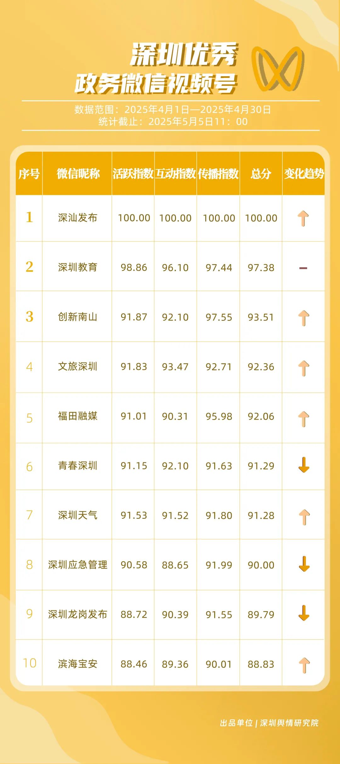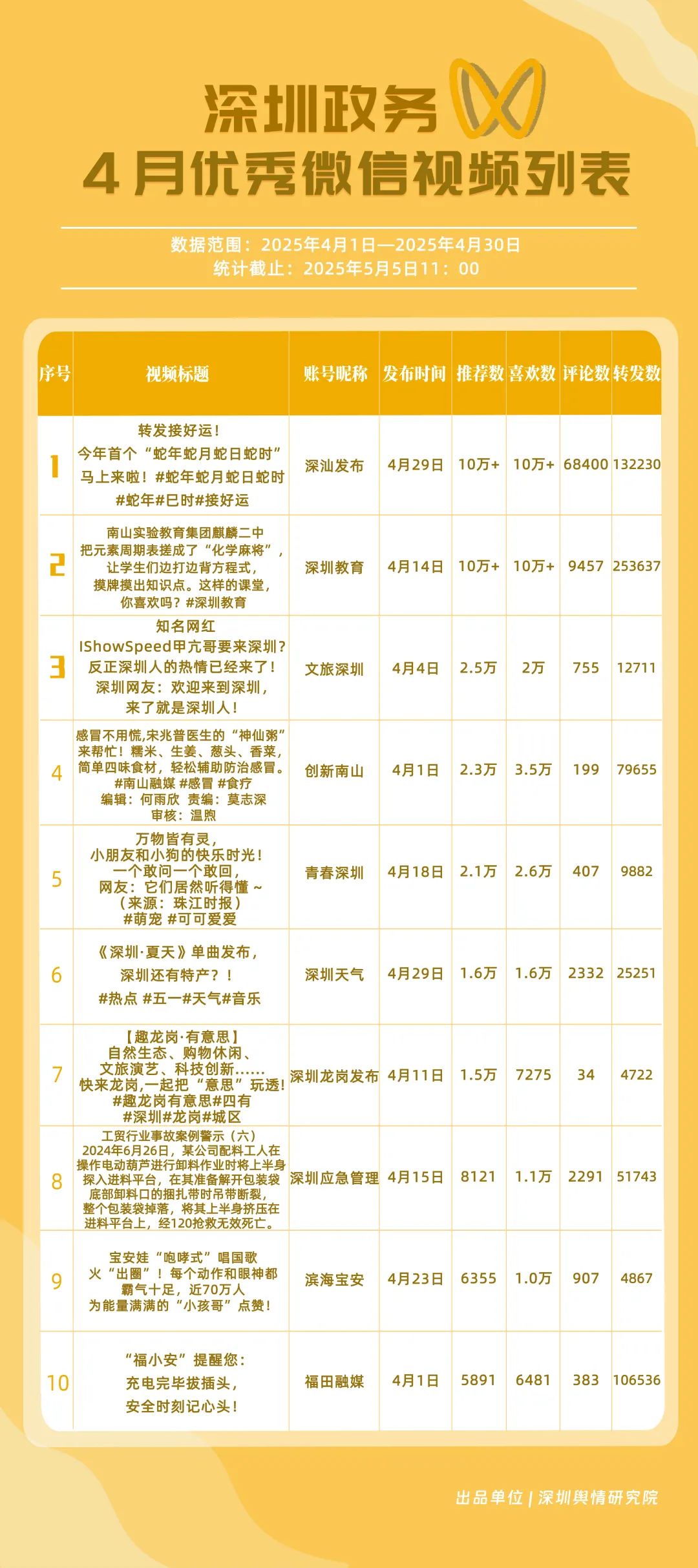 4月,獲“深圳優(yōu)秀政務(wù)微信視頻號(hào)”稱號(hào)的是“深汕發(fā)布”“深圳教育”“創(chuàng)新南山”“文旅深圳”“福田融媒”“青春深圳”“深圳天氣”“深圳應(yīng)急管理”“深圳龍崗發(fā)布”“濱海寶安”。其中,“深汕發(fā)布”憑借亮眼的數(shù)據(jù)表現(xiàn)成為榜首,其一條有關(guān)“蛇年蛇月蛇日蛇時(shí)”的視頻作品點(diǎn)贊量超10萬次、評(píng)論量超6.8萬次,轉(zhuǎn)發(fā)量超13萬次;“深圳教育”持續(xù)穩(wěn)定輸出優(yōu)質(zhì)內(nèi)容,以扎實(shí)的運(yùn)營實(shí)力鞏固自身影響力,位居榜單第2位;“創(chuàng)新南山”“文旅深圳”“福田融媒”分別位列榜單第3、4、5位,總分超92分,在區(qū)域形象宣傳、文旅資源推廣等方面展現(xiàn)出卓越的傳播效能,成為傳遞區(qū)域特色與發(fā)展動(dòng)態(tài)的重要窗口。