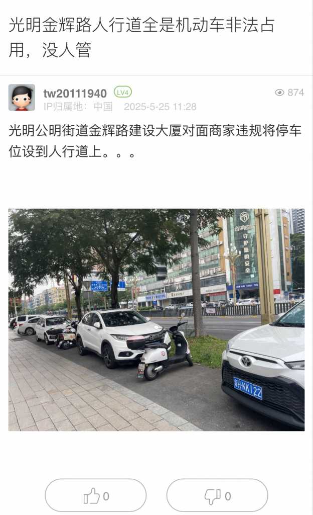 25. 帖文《光明金輝路人行道全是機(jī)動車非法占用,沒人管》