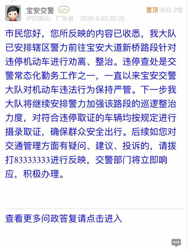 市民您好,您所反映的內(nèi)容已收悉,我大隊(duì)已安排轄區(qū)警力前往寶安大道新橋路段針對違停機(jī)動車進(jìn)行勸離、整治。違停查處是交警常態(tài)化勤務(wù)工作之一,一直以來寶安交警大隊(duì)對機(jī)動車違法行為保持嚴(yán)管。下一步我大隊(duì)將繼續(xù)安排警力加強(qiáng)該路段的巡邏整治力度,對符合違停取證的車輛均按規(guī)定進(jìn)行攝錄取證,確保群眾安全出行。后續(xù)如您對交通管理方面有疑問、建議、投訴的,請撥打83333333進(jìn)行反映,交警部門將立即響應(yīng),積極辦理。