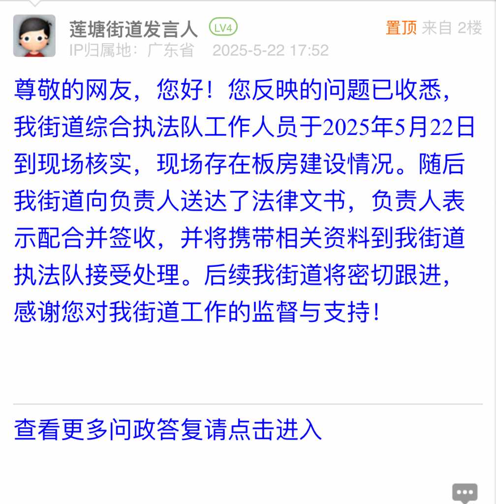 尊敬的網(wǎng)友,您好!您反映的問題已收悉,我街道綜合執(zhí)法隊(duì)工作人員于2025年5月22日到現(xiàn)場核實(shí),現(xiàn)場存在板房建設(shè)情況。隨后我街道向負(fù)責(zé)人送達(dá)了法律文書,負(fù)責(zé)人表示配合并簽收,并將攜帶相關(guān)資料到我街道執(zhí)法隊(duì)接受處理。后續(xù)我街道將密切跟進(jìn),感謝您對我街道工作的監(jiān)督與支持!