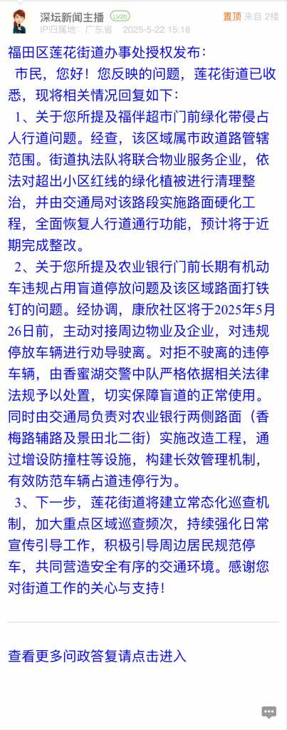 2、關(guān)于您所提及農(nóng)業(yè)銀行門前長期有機(jī)動車違規(guī)占用盲道停放問題及該區(qū)域路面打鐵釘?shù)膯栴}。經(jīng)協(xié)調(diào),康欣社區(qū)將于2025年5月26日前,主動對接周邊物業(yè)及企業(yè),對違規(guī)停放車輛進(jìn)行勸導(dǎo)駛離。對拒不駛離的違停車輛,由香蜜湖交警中隊(duì)嚴(yán)格依據(jù)相關(guān)法律法規(guī)予以處置,切實(shí)保障盲道的正常使用。同時(shí)由交通局負(fù)責(zé)對農(nóng)業(yè)銀行兩側(cè)路面(香梅路輔路及景田北二街)實(shí)施改造工程,通過增設(shè)防撞柱等設(shè)施,構(gòu)建長效管理機(jī)制,有效防范車輛占道違停行為。