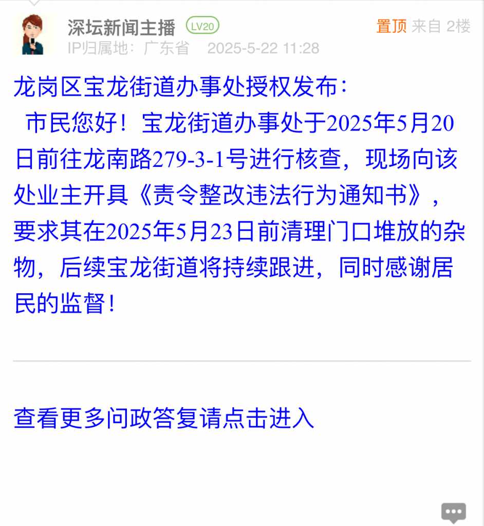 市民您好!寶龍街道辦事處于2025年5月20日前往龍南路279-3-1號進(jìn)行核查,現(xiàn)場向該處業(yè)主開具《責(zé)令整改違法行為通知書》,要求其在2025年5月23日前清理門口堆放的雜物,后續(xù)寶龍街道將持續(xù)跟進(jìn),同時(shí)感謝居民的監(jiān)督!