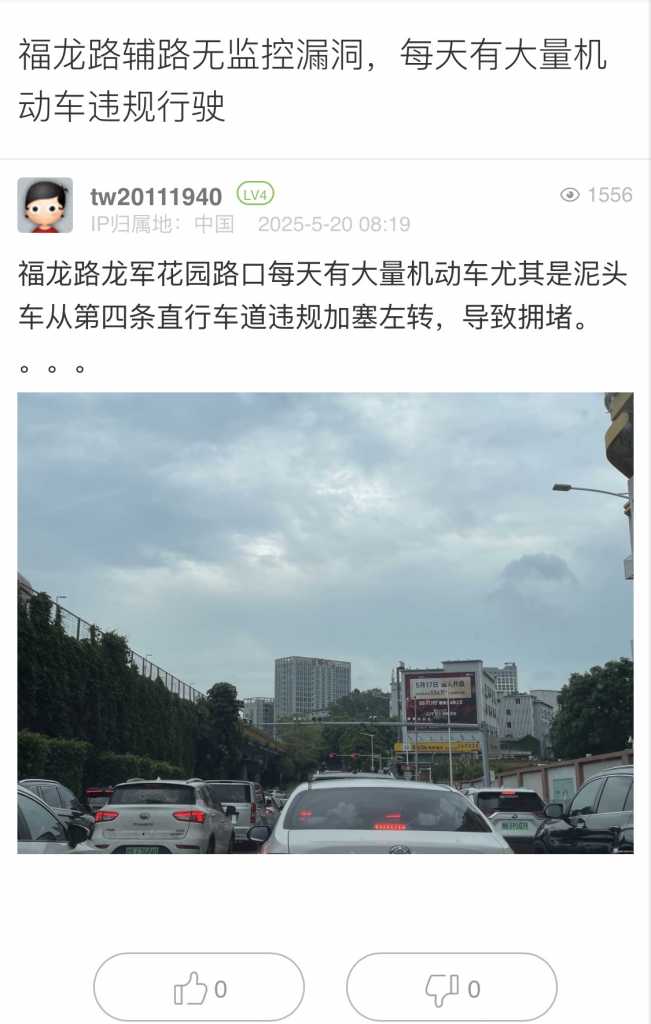 9. 帖文《福龍路輔路無監(jiān)控漏洞,每天有大量機(jī)動車違規(guī)行駛》