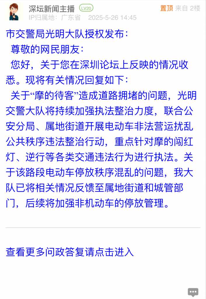 關(guān)于“摩的待客”造成道路擁堵的問題,光明交警大隊(duì)將持續(xù)加強(qiáng)執(zhí)法整治力度,聯(lián)合公安分局、屬地街道開展電動車非法營運(yùn)擾亂公共秩序違法整治行動,重點(diǎn)針對摩的闖紅燈、逆行等各類交通違法行為進(jìn)行執(zhí)法。關(guān)于該路段電動車停放秩序混亂的問題,我大隊(duì)已將相關(guān)情況反饋至屬地街道和城管部門,后續(xù)將加強(qiáng)非機(jī)動車的停放管理。