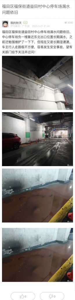 16. 帖文《福田區(qū)福保街道益田村中心停車場漏水問題依舊》