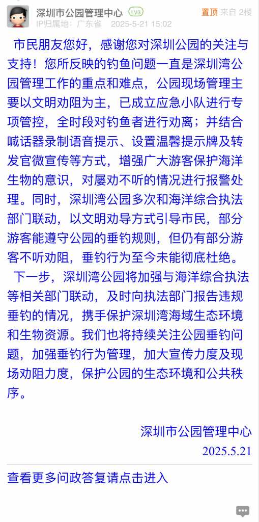 市民朋友您好,感謝您對深圳公園的關(guān)注與支持!您所反映的釣魚問題一直是深圳灣公園管理工作的重點(diǎn)和難點(diǎn),公園現(xiàn)場管理主要以文明勸阻為主,已成立應(yīng)急小隊(duì)進(jìn)行專項(xiàng)管控,全時(shí)段對釣魚者進(jìn)行勸離;并結(jié)合喊話器錄制語音提示、設(shè)置溫馨提示牌及轉(zhuǎn)發(fā)官微宣傳等方式,增強(qiáng)廣大游客保護(hù)海洋生物的意識,對屢勸不聽的情況進(jìn)行報(bào)警處理。同時(shí),深圳灣公園多次和海洋綜合執(zhí)法部門聯(lián)動,以文明勸導(dǎo)方式引導(dǎo)市民,部分游客能遵守公園的垂釣規(guī)則,但仍有部分游客不聽勸阻,垂釣行為至今未能徹底杜絕。