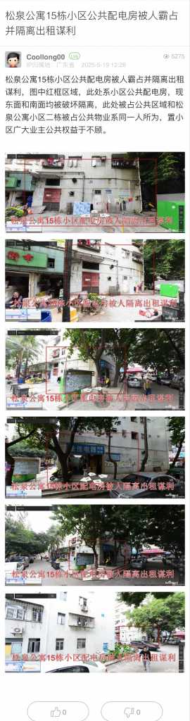 4. 帖文《松泉公寓15棟小區(qū)公共配電房被人霸占并隔離出租謀利》《松泉公寓2棟底層公共物業(yè)被人侵占謀利》
