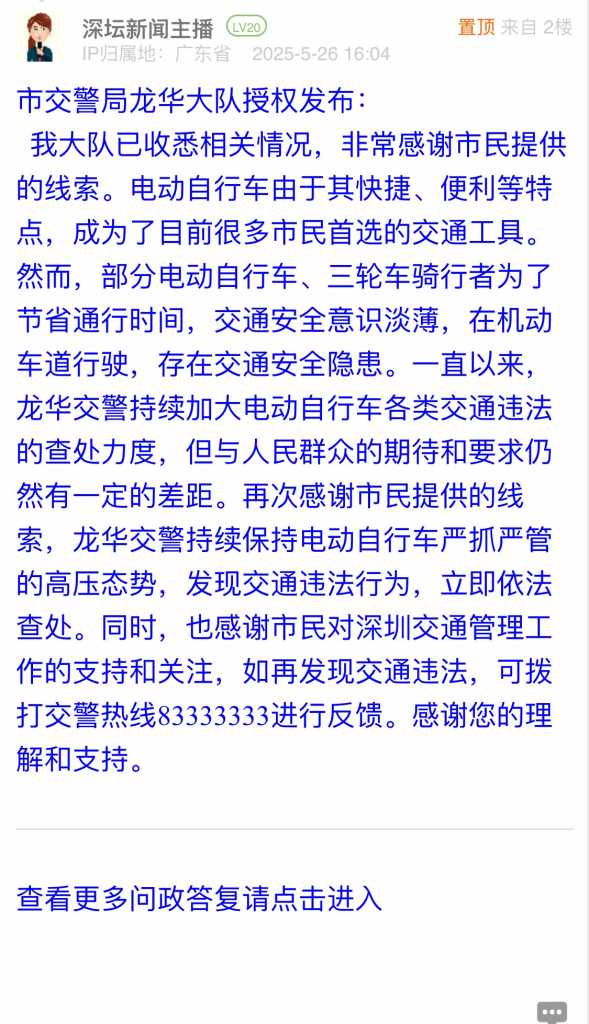 我大隊(duì)已收悉相關(guān)情況,非常感謝市民提供的線索。電動自行車由于其快捷、便利等特點(diǎn),成為了目前很多市民首選的交通工具。然而,部分電動自行車、三輪車騎行者為了節(jié)省通行時(shí)間,交通安全意識淡薄,在機(jī)動車道行駛,存在交通安全隱患。一直以來,龍華交警持續(xù)加大電動自行車各類交通違法的查處力度,但與人民群眾的期待和要求仍然有一定的差距。再次感謝市民提供的線索,龍華交警持續(xù)保持電動自行車嚴(yán)抓嚴(yán)管的高壓態(tài)勢,發(fā)現(xiàn)交通違法行為,立即依法查處。同時(shí),也感謝市民對深圳交通管理工作的支持和關(guān)注,如再發(fā)現(xiàn)交通違法,可撥打交警熱線83333333進(jìn)行反饋。感謝您的理解和支持。