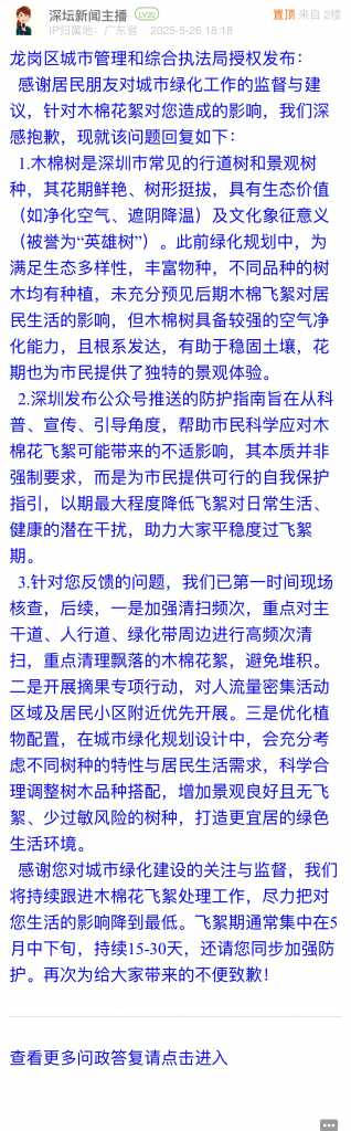 2.深圳發(fā)布公眾號推送的防護(hù)指南旨在從科普、宣傳、引導(dǎo)角度,幫助市民科學(xué)應(yīng)對木棉花飛絮可能帶來的不適影響,其本質(zhì)并非強(qiáng)制要求,而是為市民提供可行的自我保護(hù)指引,以期最大程度降低飛絮對日常生活、健康的潛在干擾,助力大家平穩(wěn)度過飛絮期。