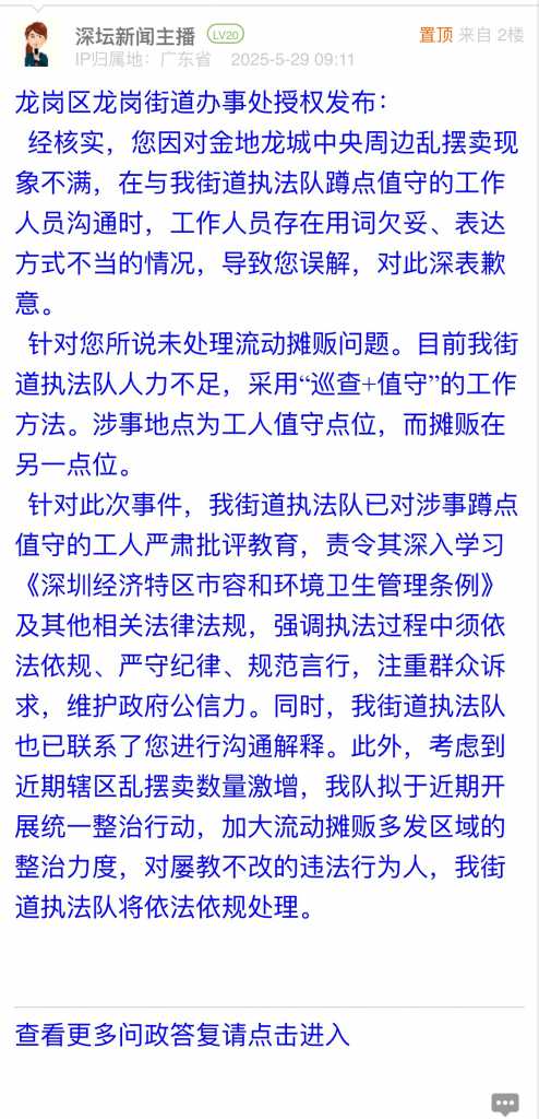 針對此次事件,我街道執(zhí)法隊(duì)已對涉事蹲點(diǎn)值守的工人嚴(yán)肅批評教育,責(zé)令其深入學(xué)習(xí)《深圳經(jīng)濟(jì)特區(qū)市容和環(huán)境衛(wèi)生管理?xiàng)l例》及其他相關(guān)法律法規(guī),強(qiáng)調(diào)執(zhí)法過程中須依法依規(guī)、嚴(yán)守紀(jì)律、規(guī)范言行,注重群眾訴求,維護(hù)政府公信力。同時(shí),我街道執(zhí)法隊(duì)也已聯(lián)系了您進(jìn)行溝通解釋。此外,考慮到近期轄區(qū)亂擺賣數(shù)量激增,我隊(duì)擬于近期開展統(tǒng)一整治行動,加大流動攤販多發(fā)區(qū)域的整治力度,對屢教不改的違法行為人,我街道執(zhí)法隊(duì)將依法依規(guī)處理。