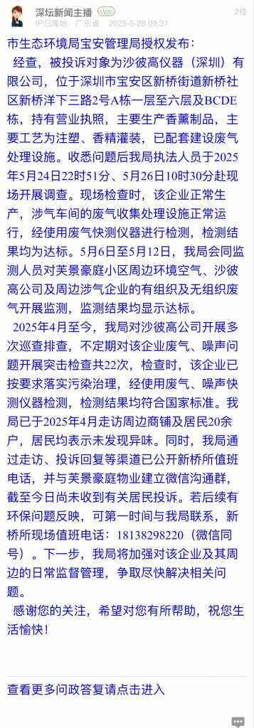 經(jīng)查,被投訴對象為沙彼高儀器(深圳)有限公司,位于深圳市寶安區(qū)新橋街道新橋社區(qū)新橋洋下三路2號A棟一層至六層及BCDE棟,持有營業(yè)執(zhí)照,主要生產(chǎn)香薰制品,主要工藝為注塑、香精灌裝,已配套建設(shè)廢氣處理設(shè)施。收悉問題后我局執(zhí)法人員于2025年5月24日22時(shí)51分、5月26日10時(shí)30分赴現(xiàn)場開展調(diào)查?,F(xiàn)場檢查時(shí),該企業(yè)正常生產(chǎn),涉氣車間的廢氣收集處理設(shè)施正常運(yùn)行,經(jīng)使用廢氣快測儀器進(jìn)行檢測,檢測結(jié)果均為達(dá)標(biāo)。5月6日至5月12日,我局會同監(jiān)測人員對芙景豪庭小區(qū)周邊環(huán)境空氣、沙彼高公司及周邊涉氣企業(yè)的有組織及無組織廢氣開展監(jiān)測,監(jiān)測結(jié)果均顯示達(dá)標(biāo)。