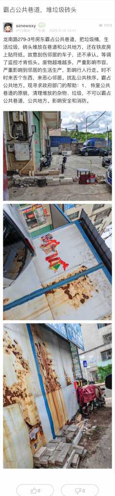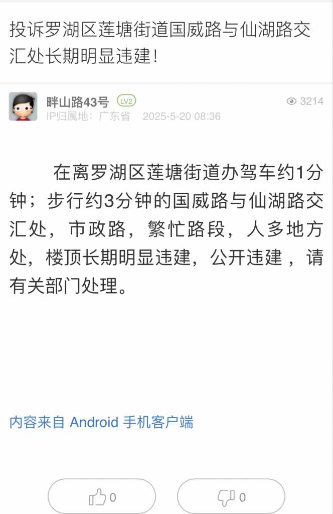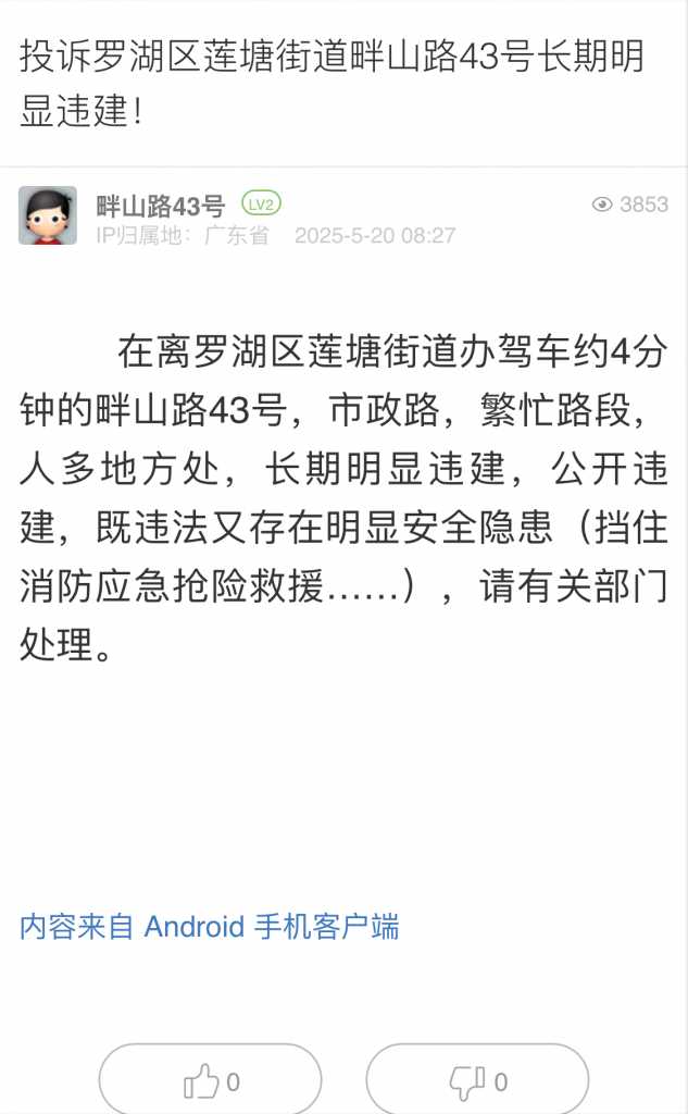 10. 帖文《投訴羅湖區(qū)蓮塘街道畔山路43號長期明顯違建!》
