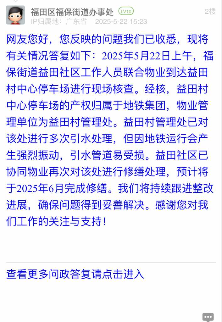 網(wǎng)友您好,您反映的問題我們已收悉,現(xiàn)將有關(guān)情況答復(fù)如下:2025年5月22日上午,福保街道益田社區(qū)工作人員聯(lián)合物業(yè)到達(dá)益田村中心停車場進(jìn)行現(xiàn)場核查。經(jīng)核,益田村中心停車場的產(chǎn)權(quán)歸屬于地鐵集團(tuán),物業(yè)管理單位為益田村管理處。益田村管理處已對該處進(jìn)行多次引水處理,但因地鐵運(yùn)行會產(chǎn)生強(qiáng)烈振動,引水管道易受損。益田社區(qū)已協(xié)同物業(yè)再次對該處進(jìn)行修繕處理,預(yù)計(jì)將于2025年6月完成修繕。我們將持續(xù)跟進(jìn)整改進(jìn)展,確保問題得到妥善解決。感謝您對我們工作的關(guān)注與支持!
