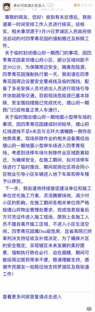 尊敬的網(wǎng)友,您好!收到有關(guān)反饋后,我街道第一時(shí)間安排工作人員進(jìn)行核實(shí)。經(jīng)核實(shí),相關(guān)事項(xiàng)源于5月19日羅湖區(qū)人民政府依法啟動的對四季青花園的強(qiáng)制搬遷及拆除工作。