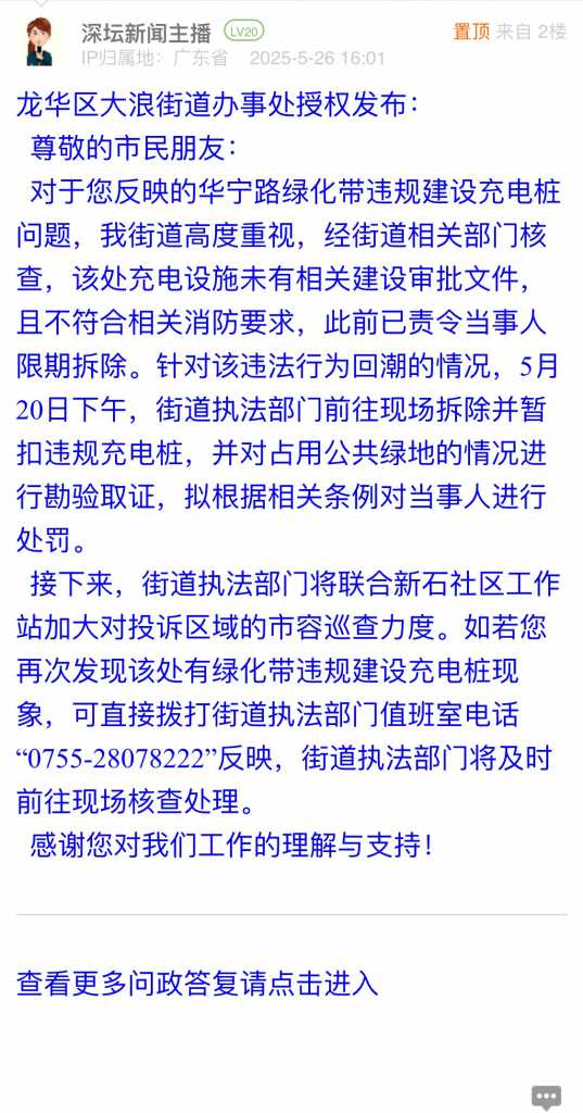 6.帖文《龍華城管局,五次投訴,大浪華寧路充電樁仍霸占綠化帶》