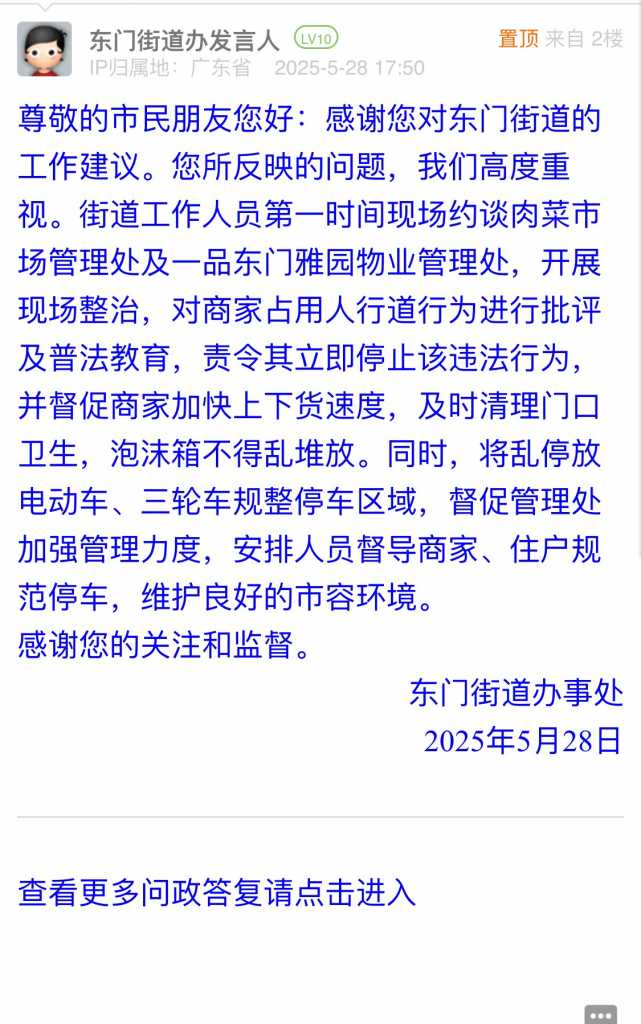 尊敬的市民朋友您好:感謝您對東門街道的工作建議。您所反映的問題,我們高度重視。街道工作人員第一時(shí)間現(xiàn)場約談肉菜市場管理處及一品東門雅園物業(yè)管理處,開展現(xiàn)場整治,對商家占用人行道行為進(jìn)行批評及普法教育,責(zé)令其立即停止該違法行為,并督促商家加快上下貨速度,及時(shí)清理門口衛(wèi)生,泡沫箱不得亂堆放。同時(shí),將亂停放電動車、三輪車規(guī)整停車區(qū)域,督促管理處加強(qiáng)管理力度,安排人員督導(dǎo)商家、住戶規(guī)范停車,維護(hù)良好的市容環(huán)境。
