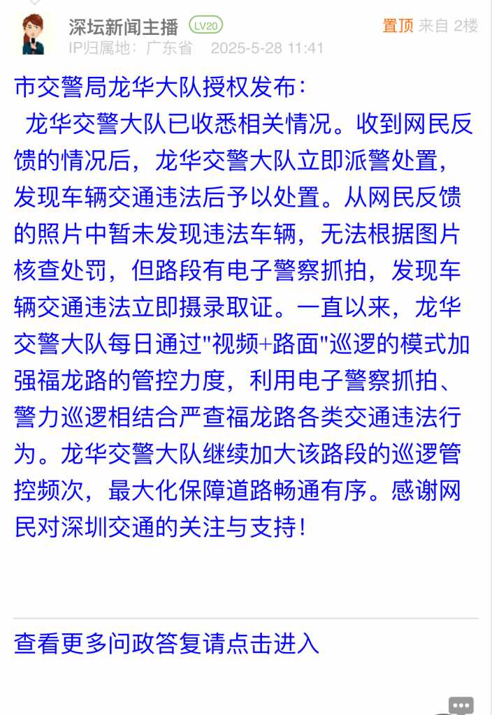 龍華交警大隊(duì)已收悉相關(guān)情況。收到網(wǎng)民反饋的情況后,龍華交警大隊(duì)立即派警處置,發(fā)現(xiàn)車輛交通違法后予以處置。從網(wǎng)民反饋的照片中暫未發(fā)現(xiàn)違法車輛,無法根據(jù)圖片核查處罰,但路段有電子警察抓拍,發(fā)現(xiàn)車輛交通違法立即攝錄取證。一直以來,龍華交警大隊(duì)每日通過"視頻+路面"巡邏的模式加強(qiáng)福龍路的管控力度,利用電子警察抓拍、警力巡邏相結(jié)合嚴(yán)查福龍路各類交通違法行為。龍華交警大隊(duì)繼續(xù)加大該路段的巡邏管控頻次,最大化保障道路暢通有序。感謝網(wǎng)民對深圳交通的關(guān)注與支持!