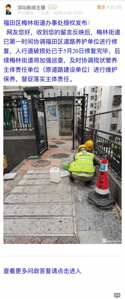 網(wǎng)友您好,收到您的留言反映后,梅林街道已第一時(shí)間協(xié)調(diào)福田區(qū)道路養(yǎng)護(hù)單位進(jìn)行修復(fù),人行道破損處已于5月20日修復(fù)完畢,后續(xù)梅林街道將加強(qiáng)巡查,及時(shí)協(xié)調(diào)現(xiàn)狀管養(yǎng)主體責(zé)任單位(原道路建設(shè)單位)進(jìn)行維護(hù)保養(yǎng),督促落實(shí)主體責(zé)任。
