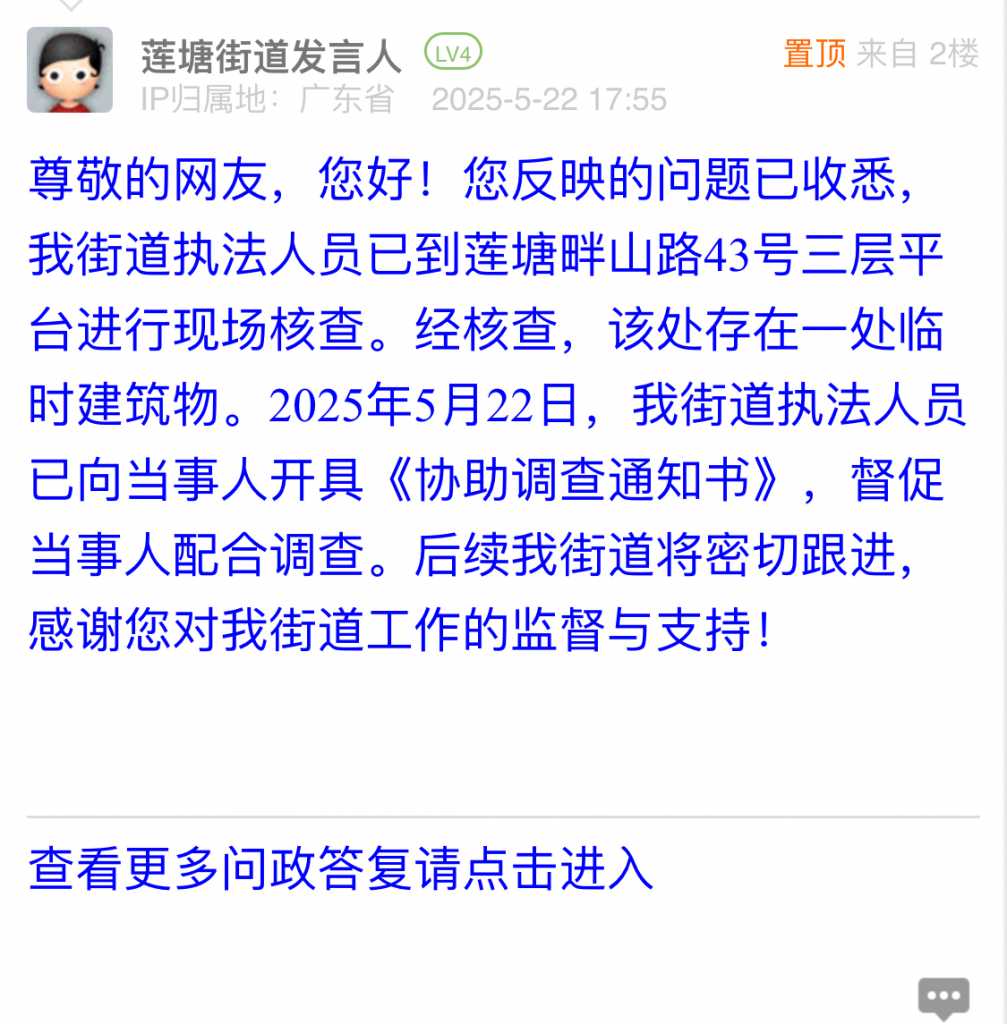 尊敬的網(wǎng)友,您好!您反映的問題已收悉,我街道執(zhí)法人員已到蓮塘畔山路43號三層平臺進(jìn)行現(xiàn)場核查。經(jīng)核查,該處存在一處臨時(shí)建筑物。2025年5月22日,我街道執(zhí)法人員已向當(dāng)事人開具《協(xié)助調(diào)查通知書》,督促當(dāng)事人配合調(diào)查。后續(xù)我街道將密切跟進(jìn),感謝您對我街道工作的監(jiān)督與支持!