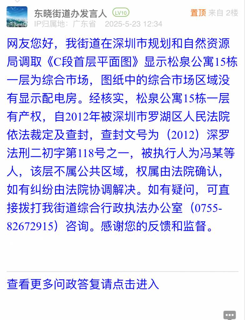 網(wǎng)友您好,我街道在深圳市規(guī)劃和自然資源局調(diào)取《C段首層平面圖》顯示松泉公寓15棟一層為綜合市場,圖紙中的綜合市場區(qū)域沒有顯示配電房。經(jīng)核實(shí),松泉公寓15棟一層有產(chǎn)權(quán),自2012年被深圳市羅湖區(qū)人民法院依法裁定及查封,查封文號為(2012)深羅法刑二初字第118號之一,被執(zhí)行人為馮某等人,該層不屬公共區(qū)域,權(quán)屬由法院確認(rèn),如有糾紛由法院協(xié)調(diào)解決。如有疑問,可直接撥打我街道綜合行政執(zhí)法辦公室(0755-82672915)咨詢。感謝您的反饋和監(jiān)督。