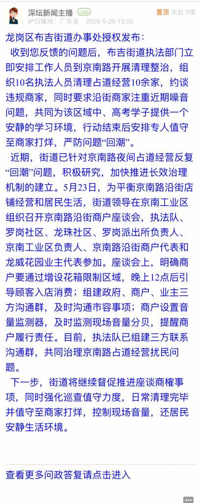 收到您反饋的問題后,布吉街道執(zhí)法部門立即安排工作人員到京南路開展清理整治,組織10名執(zhí)法人員清理占道經(jīng)營10余家,約談違規(guī)商家,同時(shí)要求沿街商家注重近期噪音問題,共同為該區(qū)域中、高考學(xué)子提供一個(gè)安靜的學(xué)習(xí)環(huán)境,行動結(jié)束后安排專人值守至商家打烊,嚴(yán)防問題“回潮”。