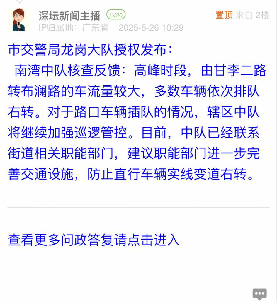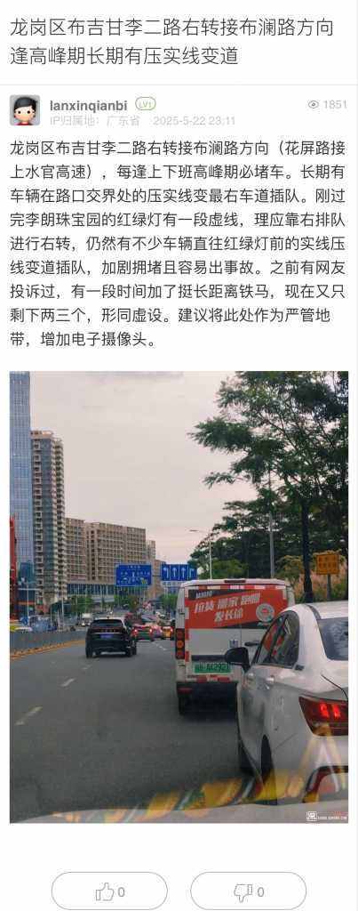 19. 帖文《龍崗區(qū)布吉甘李二路右轉(zhuǎn)接布瀾路方向逢高峰期長期有壓實(shí)線變道》