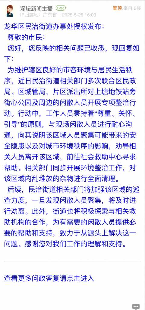 后續(xù),民治街道相關(guān)部門將加強(qiáng)該區(qū)域的巡查力度,一旦發(fā)現(xiàn)閑散人員聚集,將及時(shí)進(jìn)行勸離。此外,街道也將積極探索與相關(guān)救助機(jī)構(gòu)的合作,為有需要的閑散人員提供必要的幫助和支持,致力于從源頭上解決這一問題。感謝您對我們工作的理解和支持。