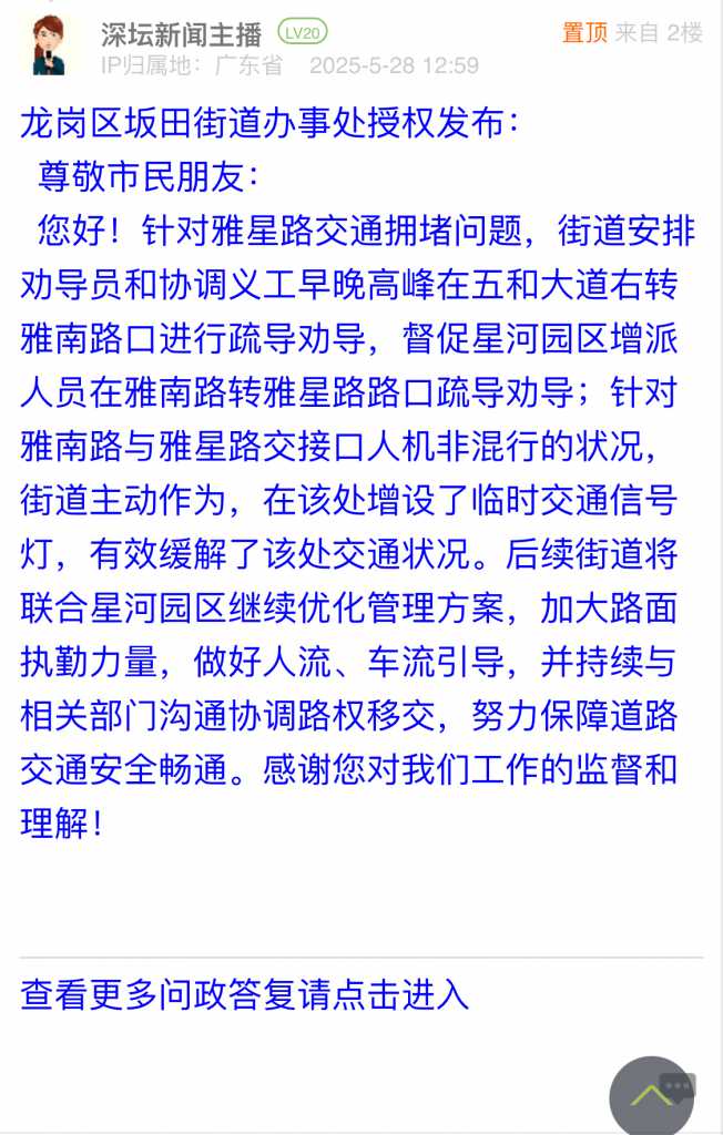 您好!針對雅星路交通擁堵問題,街道安排勸導(dǎo)員和協(xié)調(diào)義工早晚高峰在五和大道右轉(zhuǎn)雅南路口進(jìn)行疏導(dǎo)勸導(dǎo),督促星河園區(qū)增派人員在雅南路轉(zhuǎn)雅星路路口疏導(dǎo)勸導(dǎo);針對雅南路與雅星路交接口人機(jī)非混行的狀況,街道主動作為,在該處增設(shè)了臨時(shí)交通信號燈,有效緩解了該處交通狀況。后續(xù)街道將聯(lián)合星河園區(qū)繼續(xù)優(yōu)化管理方案,加大路面執(zhí)勤力量,做好人流、車流引導(dǎo),并持續(xù)與相關(guān)部門溝通協(xié)調(diào)路權(quán)移交,努力保障道路交通安全暢通。感謝您對我們工作的監(jiān)督和理解!