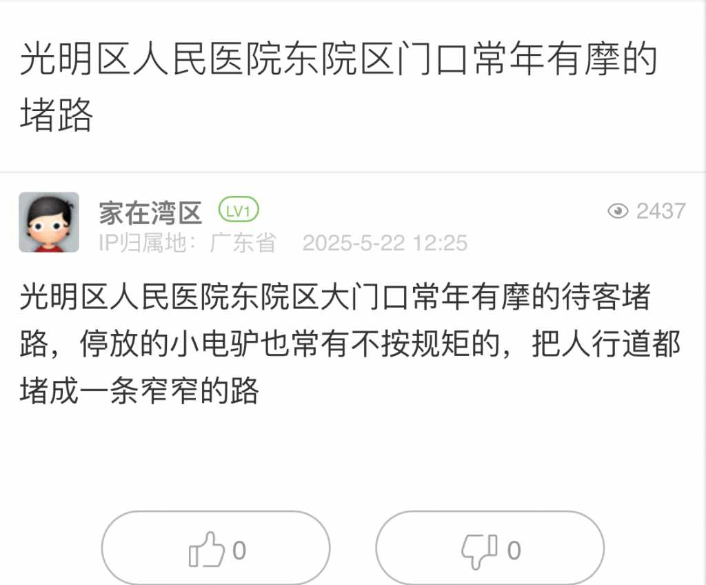17. 帖文《光明區(qū)人民醫(yī)院東院區(qū)門口常年有摩的堵路》