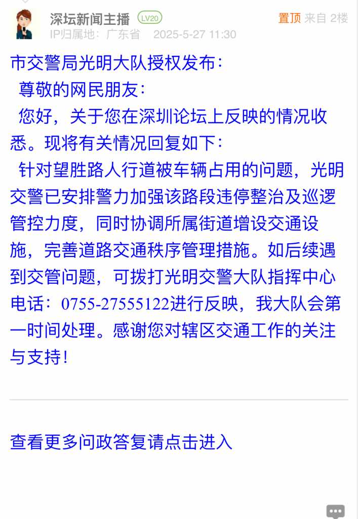 針對望勝路人行道被車輛占用的問題,光明交警已安排警力加強(qiáng)該路段違停整治及巡邏管控力度,同時(shí)協(xié)調(diào)所屬街道增設(shè)交通設(shè)施,完善道路交通秩序管理措施。如后續(xù)遇到交管問題,可撥打光明交警大隊(duì)指揮中心電話:0755-27555122進(jìn)行反映,我大隊(duì)會第一時(shí)間處理。感謝您對轄區(qū)交通工作的關(guān)注與支持!