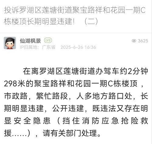 13. 帖文《投訴羅湖區(qū)蓮塘街道聚寶路祥和花園一期C棟樓頂長期明顯違建!(二)》