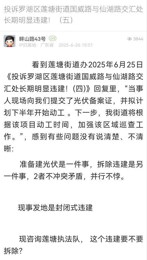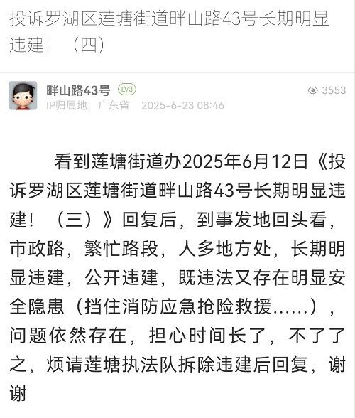 3. 帖文《投訴羅湖區(qū)蓮塘街道畔山路43號長期明顯違建?。ㄋ模?/a>》