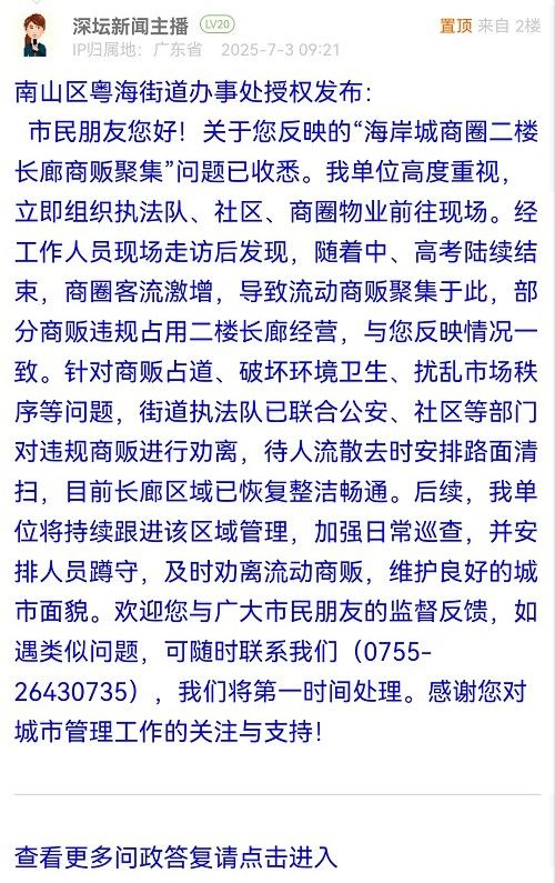 市民朋友您好!關(guān)于您反映的“海岸城商圈二樓長廊商販聚集”問題已收悉。我單位高度重視,立即組織執(zhí)法隊、社區(qū)、商圈物業(yè)前往現(xiàn)場。經(jīng)工作人員現(xiàn)場走訪后發(fā)現(xiàn),隨著中、高考陸續(xù)結(jié)束,商圈客流激增,導(dǎo)致流動商販聚集于此,部分商販違規(guī)占用二樓長廊經(jīng)營,與您反映情況一致。針對商販占道、破壞環(huán)境衛(wèi)生、擾亂市場秩序等問題,街道執(zhí)法隊已聯(lián)合公安、社區(qū)等部門對違規(guī)商販進行勸離,待人流散去時安排路面清掃,目前長廊區(qū)域已恢復(fù)整潔暢通。后續(xù),我單位將持續(xù)跟進該區(qū)域管理,加強日常巡查,并安排人員蹲守,及時勸離流動商販,維護良好的城市面貌。歡迎您與廣大市民朋友的監(jiān)督反饋,如遇類似問題,可隨時聯(lián)系我們(0755-26430735),我們將第一時間處理。感謝您對城市管理工作的關(guān)注與支持!