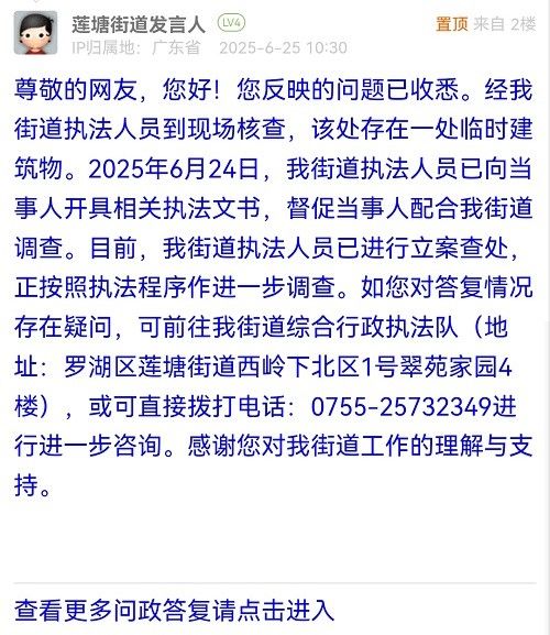 尊敬的網(wǎng)友,您好!您反映的問題已收悉。經(jīng)我街道執(zhí)法人員到現(xiàn)場核查,該處存在一處臨時建筑物。2025年6月24日,我街道執(zhí)法人員已向當(dāng)事人開具相關(guān)執(zhí)法文書,督促當(dāng)事人配合我街道調(diào)查。目前,我街道執(zhí)法人員已進行立案查處,正按照執(zhí)法程序作進一步調(diào)查。如您對答復(fù)情況存在疑問,可前往我街道綜合行政執(zhí)法隊(地址:羅湖區(qū)蓮塘街道西嶺下北區(qū)1號翠苑家園4樓),或可直接撥打電話:0755-25732349進行進一步咨詢。感謝您對我街道工作的理解與支持。