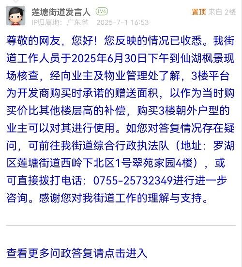 尊敬的網(wǎng)友,您好!您反映的情況已收悉。我街道工作人員于2025年6月30日下午到仙湖楓景現(xiàn)場核查,經(jīng)向業(yè)主及物業(yè)管理處了解,3樓平臺為開發(fā)商購買時承諾的贈送面積,以作為當(dāng)時購買價比其他樓層高的補償,購買3樓朝外戶型的業(yè)主可以對其進行使用。如您對答復(fù)情況存在疑問,可前往我街道綜合行政執(zhí)法隊(地址:羅湖區(qū)蓮塘街道西嶺下北區(qū)1號翠苑家園4樓),或可直接撥打電話:0755-25732349進行進一步咨詢。感謝您對我街道工作的理解與支持。