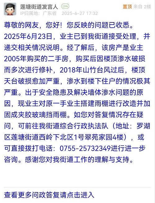 尊敬的網(wǎng)友,您好!您反映的問題已收悉。2025年6月23日,業(yè)主已到我街道接受處理,并遞交相關(guān)情況說明。經(jīng)了解后,該房產(chǎn)是業(yè)主2005年購買的二手房,購買后因樓頂滲水破損而多次進行修補,2018年山竹臺風(fēng)過后,樓頂天臺破損愈加嚴(yán)重,滲水到樓下住戶的情況極其嚴(yán)重。出于安全隱患及解決墻體滲水問題的原因,現(xiàn)業(yè)主對原一手業(yè)主搭建雨棚進行改造并加固成夾膠玻璃擋雨棚。如您對答復(fù)情況存在疑問,可前往我街道綜合行政執(zhí)法隊(地址:羅湖區(qū)蓮塘街道西嶺下北區(qū)1號翠苑家園4樓),或可直接撥打電話:0755-25732349進行進一步咨詢。感謝您對我街道工作的理解與支持。