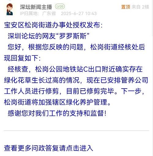 經(jīng)核查,松崗公園地鐵站C出口附近確實存在綠化花草生長過高的情況,現(xiàn)在已安排管養(yǎng)公司工作人員進行修剪,目前已修剪完畢。下一步,松崗街道將加強轄區(qū)綠化養(yǎng)護管理。