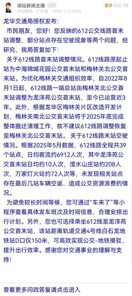 關(guān)于612線路首末站調(diào)整情況。612線路原起止站為中海錦城花園公交首末站和梅林關(guān)北公交首末站。為優(yōu)化梅林關(guān)交通組織效率,自2022年8月1日起,612線路一端總站由梅林關(guān)北公交首末站調(diào)整為龍澤苑公交首末站,至今已運營近3年。此外,根據(jù)龍華區(qū)梅林關(guān)片區(qū)改造開發(fā)計劃,梅林關(guān)南北公交首末站將于2025年底完成整體搬遷清理工作,故不建議612線路調(diào)整恢復(fù)至梅林關(guān)北公交首末站。 關(guān)于612線路末站空駛情況。根據(jù)2025年5月數(shù)據(jù),612線路全程共39個站點,日均客流約6912人次,其中龍澤苑公交首末站日均約10人次,瀅水山莊站約208人次,萬家燈火站約72人次等,未發(fā)現(xiàn)相關(guān)站點存在最后幾站車輛空返、造成公交資源浪費的情況。