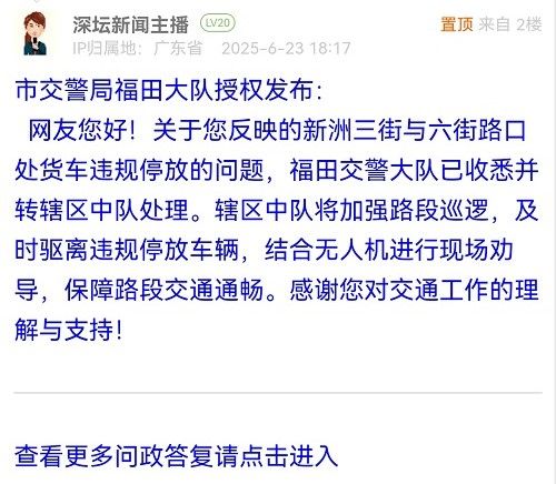 網(wǎng)友您好!關(guān)于您反映的新洲三街與六街路口處貨車違規(guī)停放的問題,福田交警大隊已收悉并轉(zhuǎn)轄區(qū)中隊處理。轄區(qū)中隊將加強路段巡邏,及時驅(qū)離違規(guī)停放車輛,結(jié)合無人機進行現(xiàn)場勸導(dǎo),保障路段交通通暢。感謝您對交通工作的理解與支持!