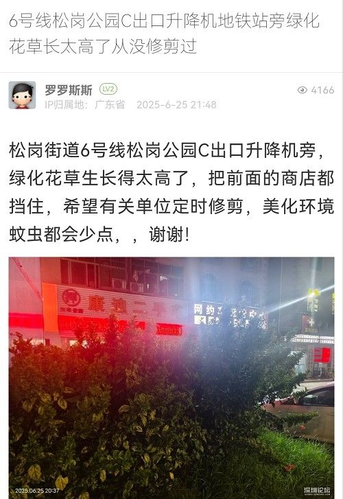 9. 帖文 《6號線松崗公園C出口升降機地鐵站旁綠化花草長太高了從沒修剪過》