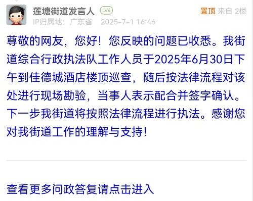 尊敬的網(wǎng)友,您好!您反映的問題已收悉。我街道綜合行政執(zhí)法隊工作人員于2025年6月30日下午到佳德城酒店樓頂巡查,隨后按法律流程對該處進行現(xiàn)場勘驗,當(dāng)事人表示配合并簽字確認(rèn)。下一步我街道將按照法律流程進行執(zhí)法。感謝您對我街道工作的理解與支持!