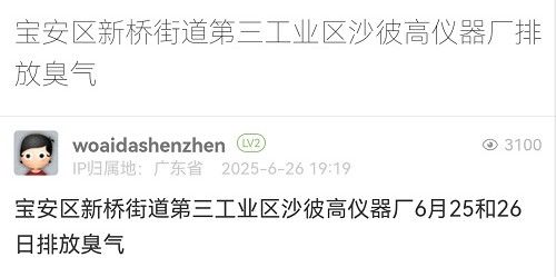 15. 帖文《寶安區(qū)新橋街道第三工業(yè)區(qū)沙彼高儀器廠排放臭氣》《寶安新橋三工業(yè)區(qū)沙彼高儀器廠6月27-28日仍排放臭氣擾民》