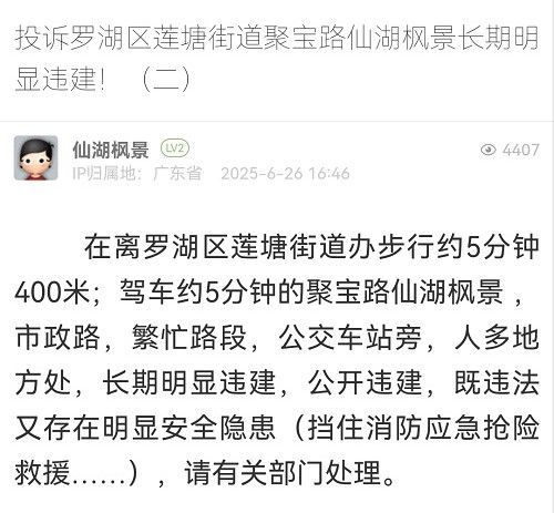 14. 帖文《投訴羅湖區(qū)蓮塘街道聚寶路仙湖楓景長期明顯違建?。ǘ?/a>》