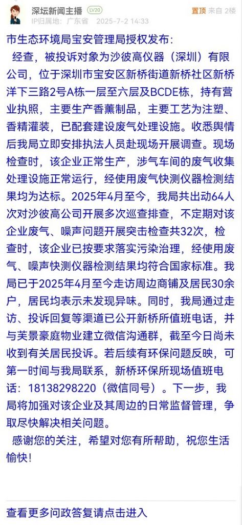 經(jīng)查,被投訴對象為沙彼高儀器(深圳)有限公司,位于深圳市寶安區(qū)新橋街道新橋社區(qū)新橋洋下三路2號A棟一層至六層及BCDE棟,持有營業(yè)執(zhí)照,主要生產(chǎn)香薰制品,主要工藝為注塑、香精灌裝,已配套建設(shè)廢氣處理設(shè)施。收悉輿情后我局立即安排執(zhí)法人員赴現(xiàn)場開展調(diào)查。現(xiàn)場檢查時,該企業(yè)正常生產(chǎn),涉氣車間的廢氣收集處理設(shè)施正常運行,經(jīng)使用廢氣快測儀器檢測結(jié)果均為達(dá)標(biāo)。2025年4月至今,我局共出動64人次對沙彼高公司開展多次巡查排查,不定期對該企業(yè)廢氣、噪聲問題開展突擊檢查共32次,檢查時,該企業(yè)已按要求落實污染治理,經(jīng)使用廢氣、噪聲快測儀器檢測結(jié)果均符合國家標(biāo)準(zhǔn)。我局已于2025年4月至今走訪周邊商鋪及居民30余戶,居民均表示未發(fā)現(xiàn)異味。同時,我局通過走訪、投訴回復(fù)等渠道已公開新橋所值班電話,并與芙景豪庭物業(yè)建立微信溝通群,截至今日尚未收到有關(guān)居民投訴。若后續(xù)有環(huán)保問題反映,可第一時間與我局聯(lián)系,新橋環(huán)保所現(xiàn)場值班電話:18138298220(微信同號)。下一步,我局將加強對該企業(yè)及其周邊的日常監(jiān)督管理,爭取盡快解決相關(guān)問題。