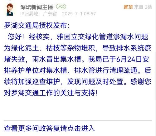 您好!經(jīng)核實,雅園立交綠化管道滲漏水問題為綠化泥土、枯枝等雜物堆積,導(dǎo)致排水系統(tǒng)瘀堵失效,雨水冒出集水槽。我局已于6月24日安排養(yǎng)護單位對集水槽、排水管進行清理疏通。后續(xù)將加強巡查維護,發(fā)現(xiàn)問題及時處置。感謝您對羅湖交通工作的關(guān)注與支持!