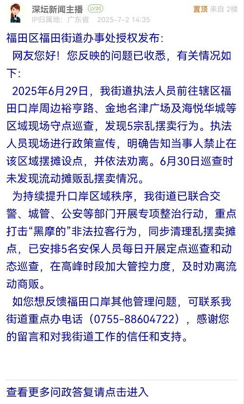 如您想反饋福田口岸其他管理問題,可聯(lián)系我街道重點辦電話(0755-88604722),感謝您的留言和對我街道工作的信任和支持。