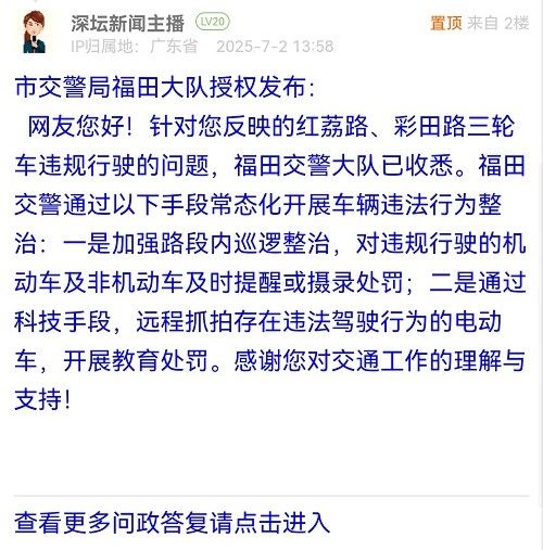 網(wǎng)友您好!針對您反映的紅荔路、彩田路三輪車違規(guī)行駛的問題,福田交警大隊已收悉。福田交警通過以下手段常態(tài)化開展車輛違法行為整治:一是加強路段內(nèi)巡邏整治,對違規(guī)行駛的機動車及非機動車及時提醒或攝錄處罰;二是通過科技手段,遠(yuǎn)程抓拍存在違法駕駛行為的電動車,開展教育處罰。感謝您對交通工作的理解與支持!