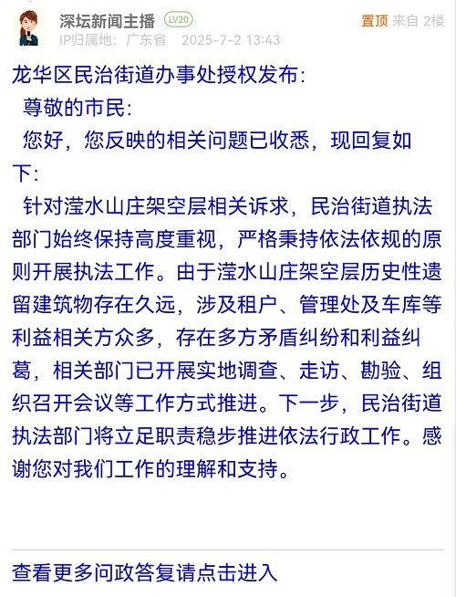 針對瀅水山莊架空層相關(guān)訴求,民治街道執(zhí)法部門始終保持高度重視,嚴(yán)格秉持依法依規(guī)的原則開展執(zhí)法工作。由于瀅水山莊架空層歷史性遺留建筑物存在久遠(yuǎn),涉及租戶、管理處及車庫等利益相關(guān)方眾多,存在多方矛盾糾紛和利益糾葛,相關(guān)部門已開展實地調(diào)查、走訪、勘驗、組織召開會議等工作方式推進。下一步,民治街道執(zhí)法部門將立足職責(zé)穩(wěn)步推進依法行政工作。感謝您對我們工作的理解和支持。