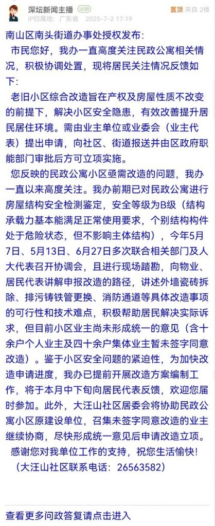 網(wǎng)友如有相關(guān)訴求、建言和意見的,可直接在深圳論壇“我說深圳事”欄目發(fā)帖進行報料、投訴,或者通過官方報料QQ以及問政熱線等渠道反映訴求。
