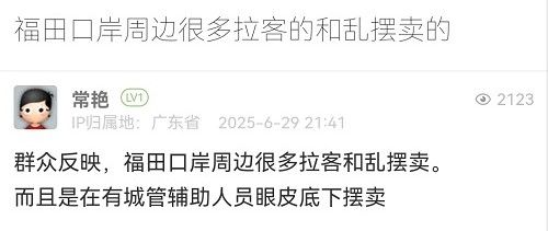 2025年6月29日,我街道執(zhí)法人員前往轄區(qū)福田口岸周邊裕亨路、金地名津廣場及海悅?cè)A城等區(qū)域現(xiàn)場守點巡查,發(fā)現(xiàn)5宗亂擺賣行為。執(zhí)法人員現(xiàn)場進行政策宣傳,明確告知當(dāng)事人禁止在該區(qū)域擺攤設(shè)點,并依法勸離。6月30日巡查時未發(fā)現(xiàn)流動攤販亂擺賣情況。